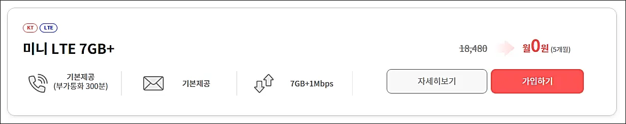미니게이트 KT 망 7GB+1Mbps 무제한 0원 요금제
