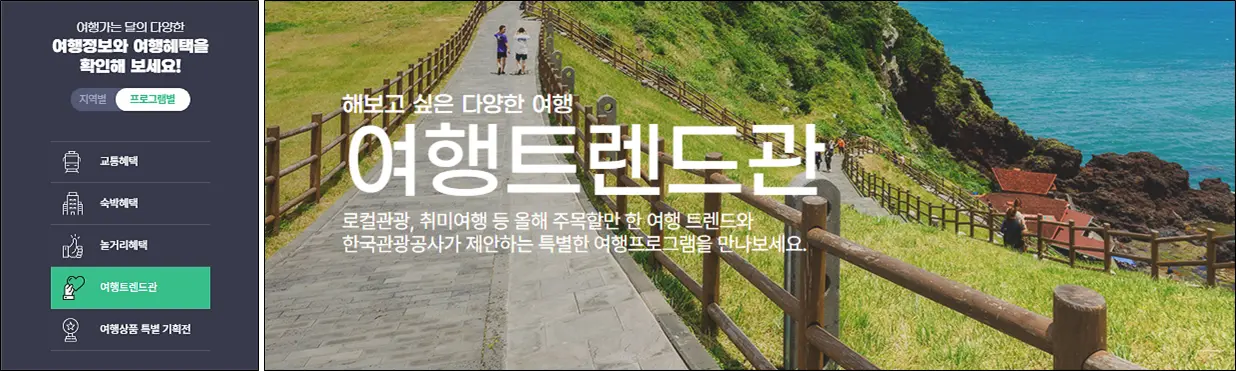관광공사에서도 이런 트렌드에 맞춰 여러 추천 여행상품들을 추천하고 있습니다.