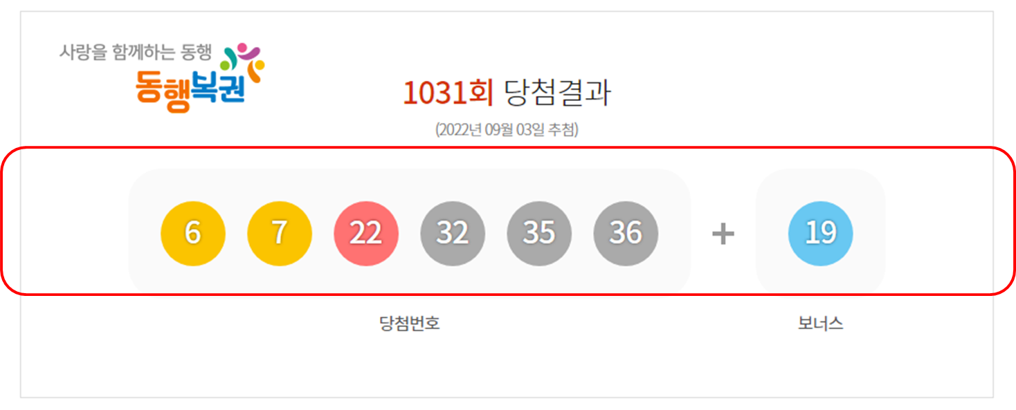 로또 1031회 당첨 번호는 6, 7, 22, 32, 35, 36 + 보너스 19 입니다.